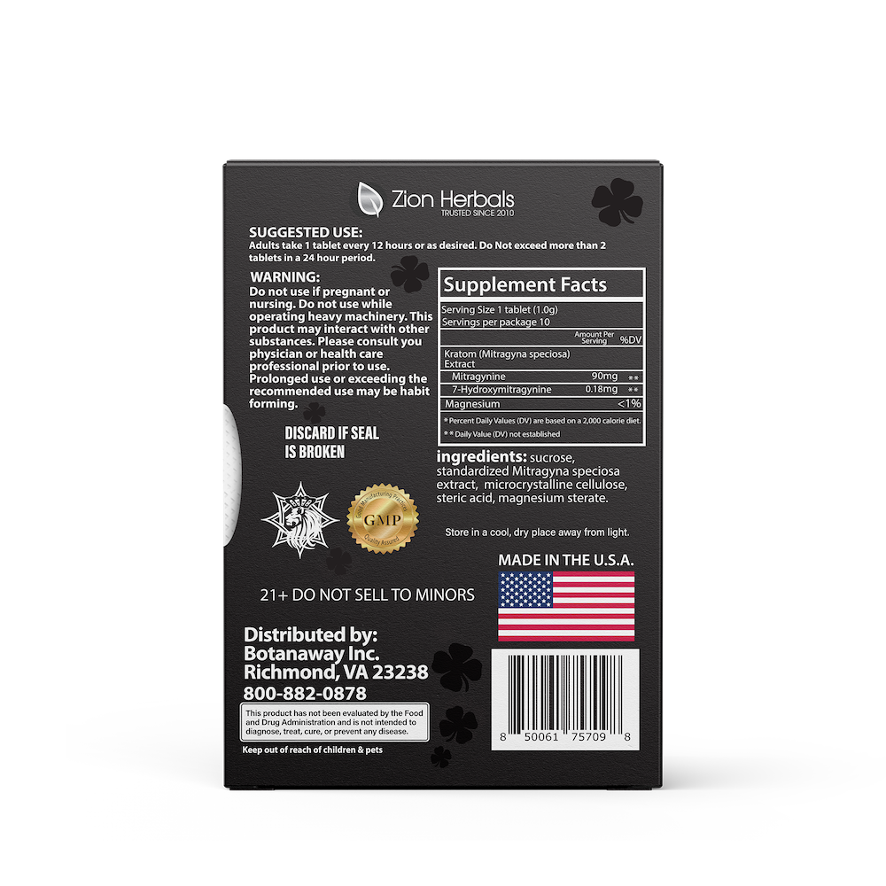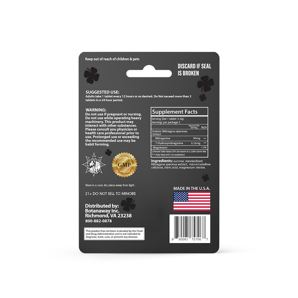 Serving size is 1 tablet. Each serving contains 90 mg of Mitragynine.