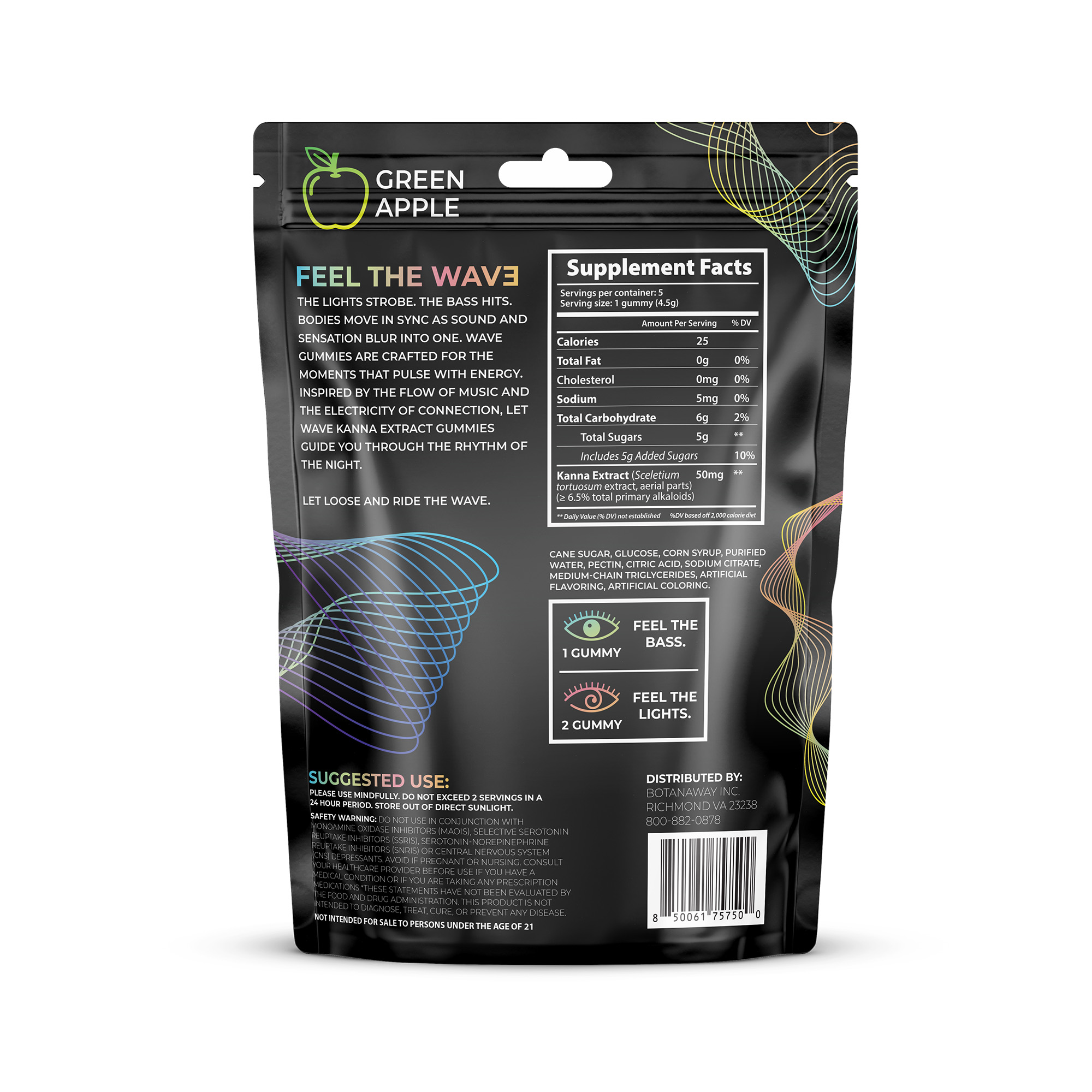 Wave Kanna Gummies keep the party hopping well into the late night, amping up the sensations of music and light. 🍏🎶 Embrace the bass, and take in the hues. These kanna extract gummies boasts a sweet burst of green apple and 50mg of premium kanna extract per piece.