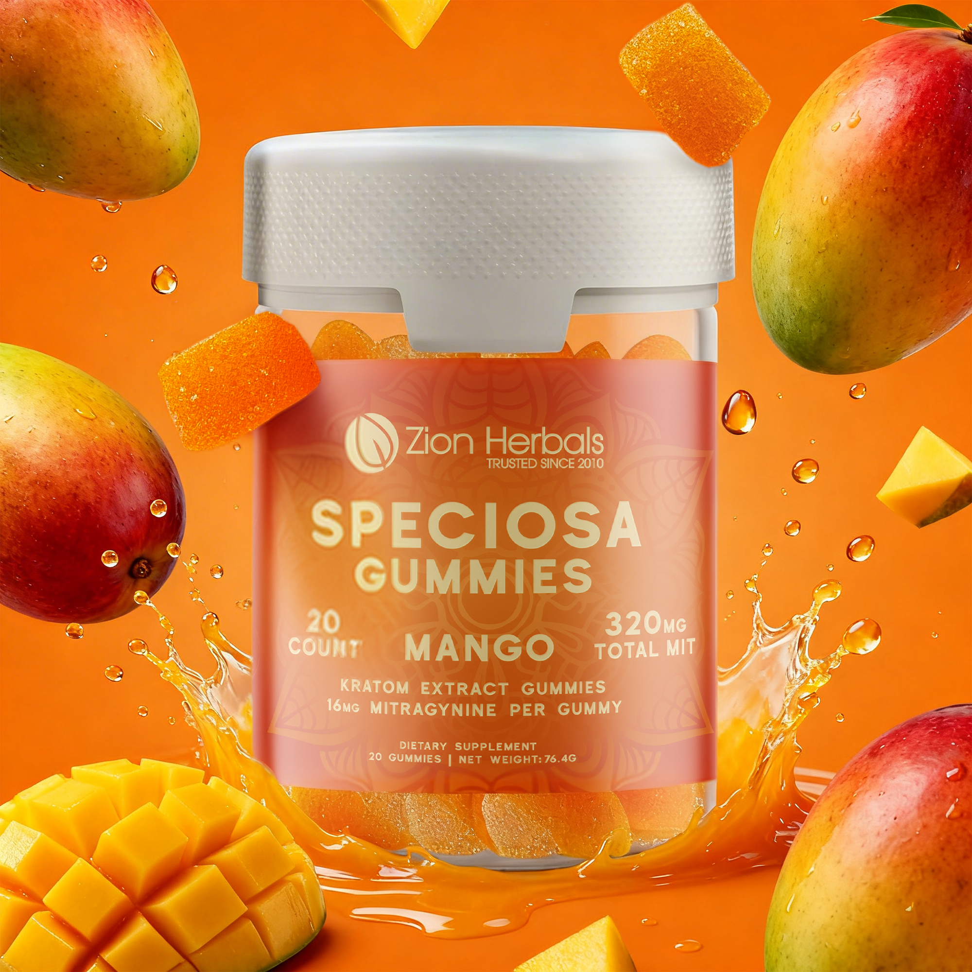 Zion Herbals Speciosa Gummies 20ct Jar 16mg MIT Each Fruity Flavored Kratom Extract